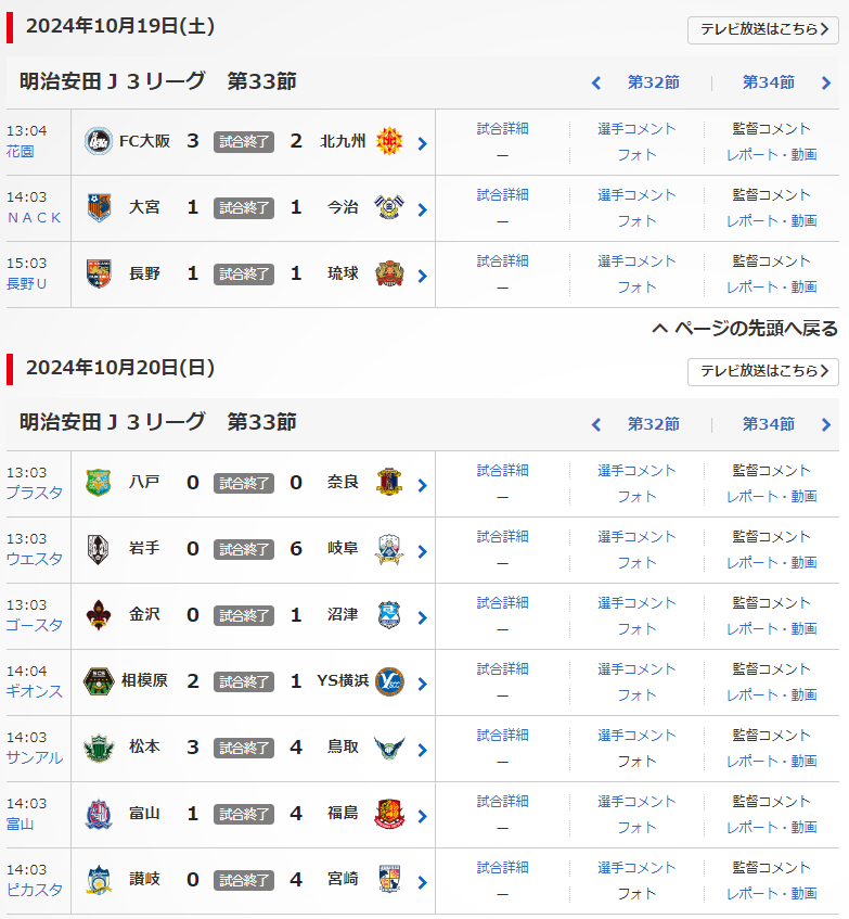 明治安田J3リーグの第33節が、10/19(土),20(日)に行われました。