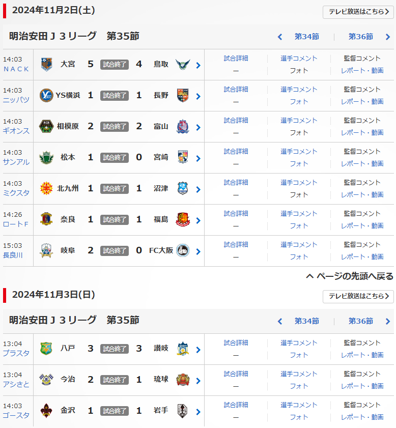 明治安田J3リーグの第35節が、11/2(土),3(日)に行われました。