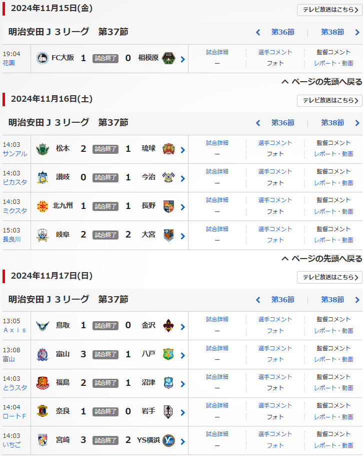 明治安田J3リーグの第37節が、11/15(金),16(土),17(日)行われました。
