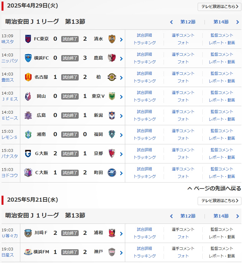 明治安田J1リーグの第13節が、4/29(火),5/21(水)に行われました。