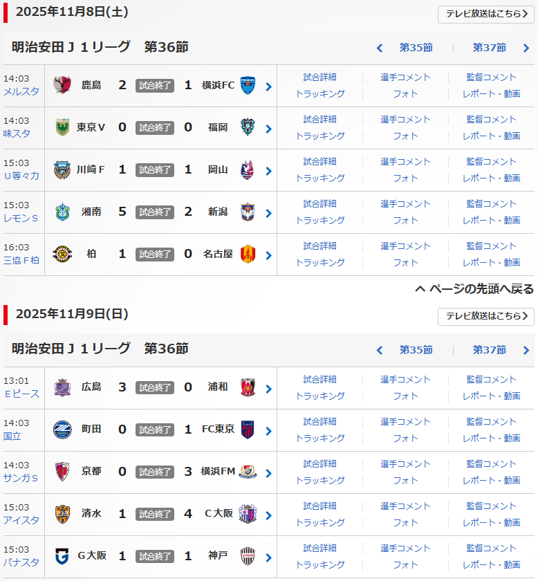 明治安田J1リーグの第36節が、11/8(土),9(日)に行われました。