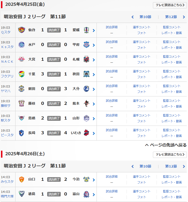 明治安田J2リーグの第11節が、4/25(金),26(土)に行われました。