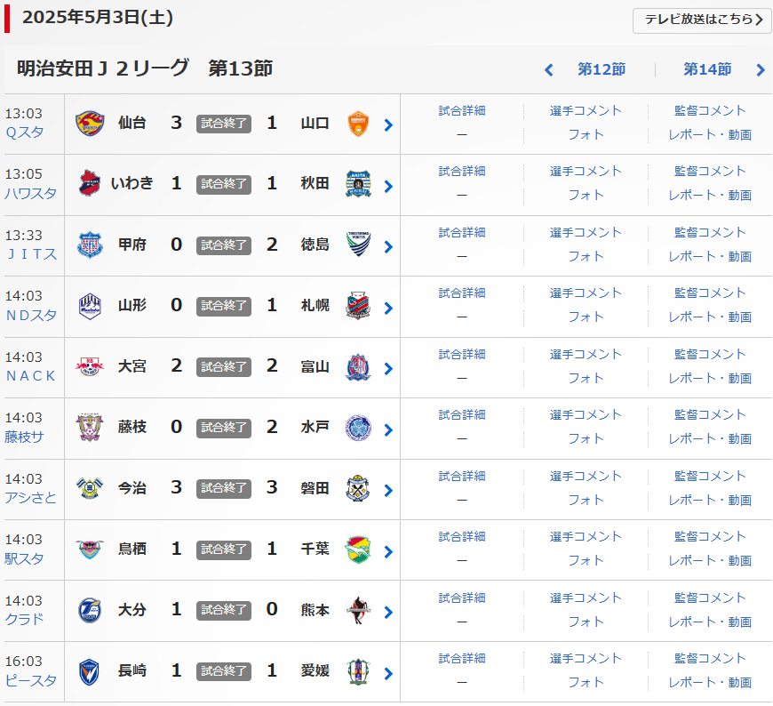 明治安田J2リーグの第13節が、5/3(土)に行われました。