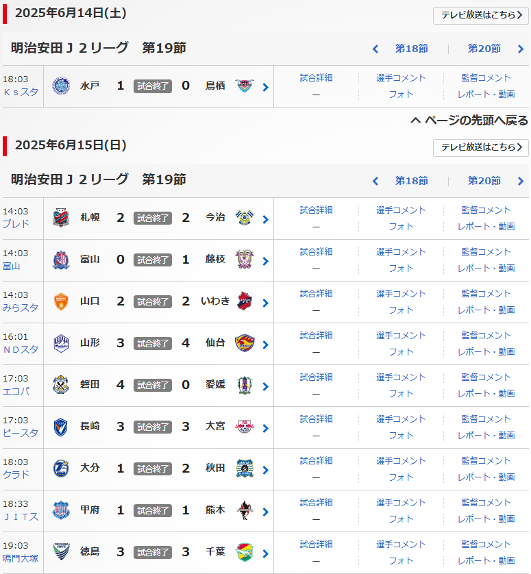 明治安田J2リーグの第19節が、6/14(土),15(日)に行われました。