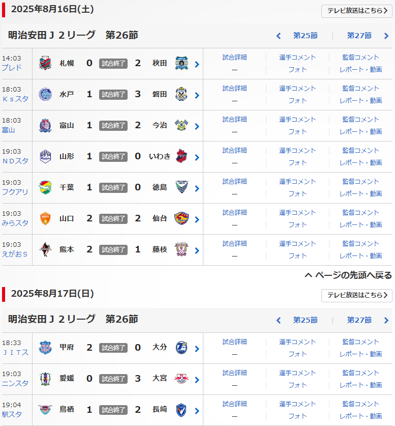 明治安田J2リーグの第26節が、8/16(土),17(日)に行われました。
