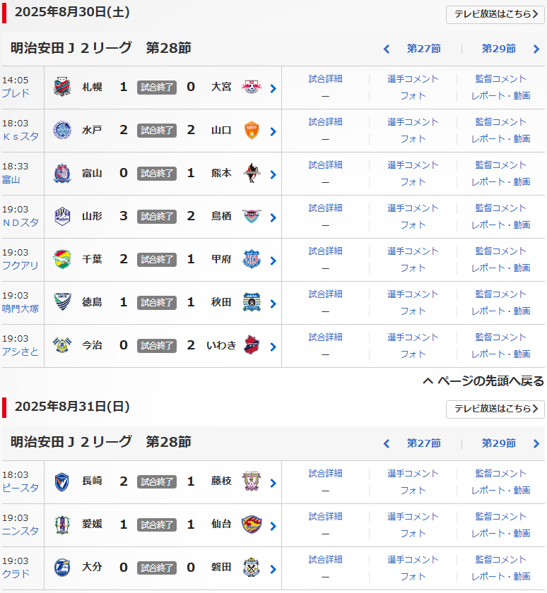 明治安田J2リーグの第28節が、8/30(土),31(日)に行われました。