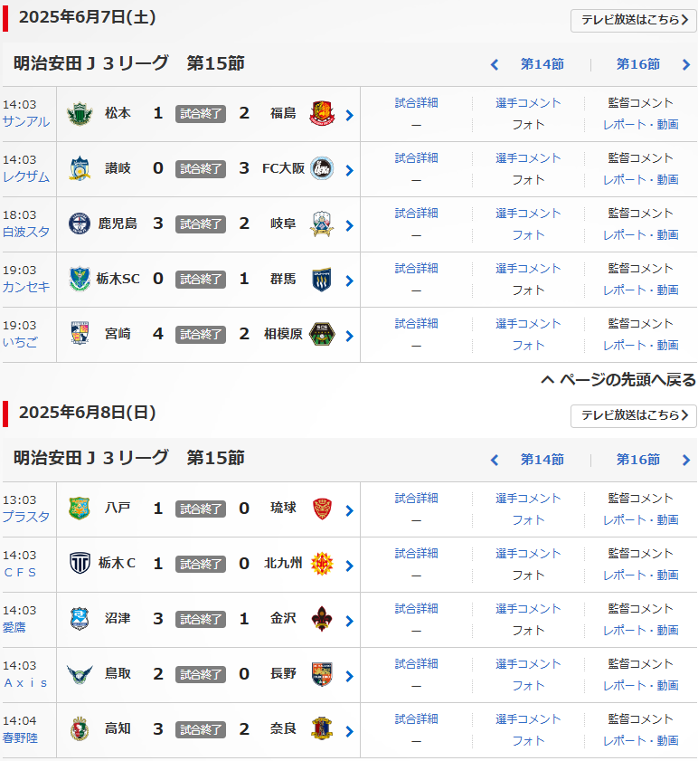 明治安田J3リーグの第15節が、6/7(土),8(日)に行われました。