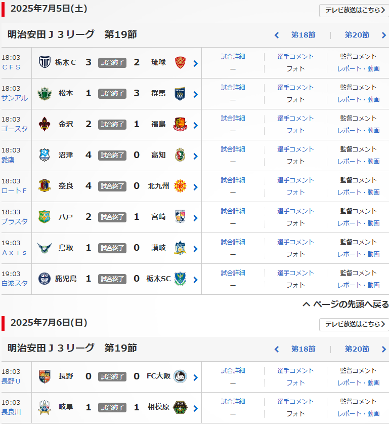 明治安田J3リーグの第19節が、7/5(土),6(日)に行われました。
