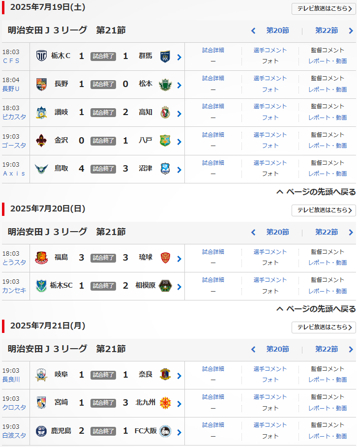明治安田J3リーグの第21節が、7/19(土),20(日),21(月)に行われました。