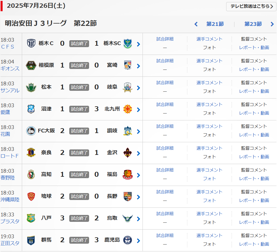 明治安田J3リーグの第22節が、7/26(土)に行われました。