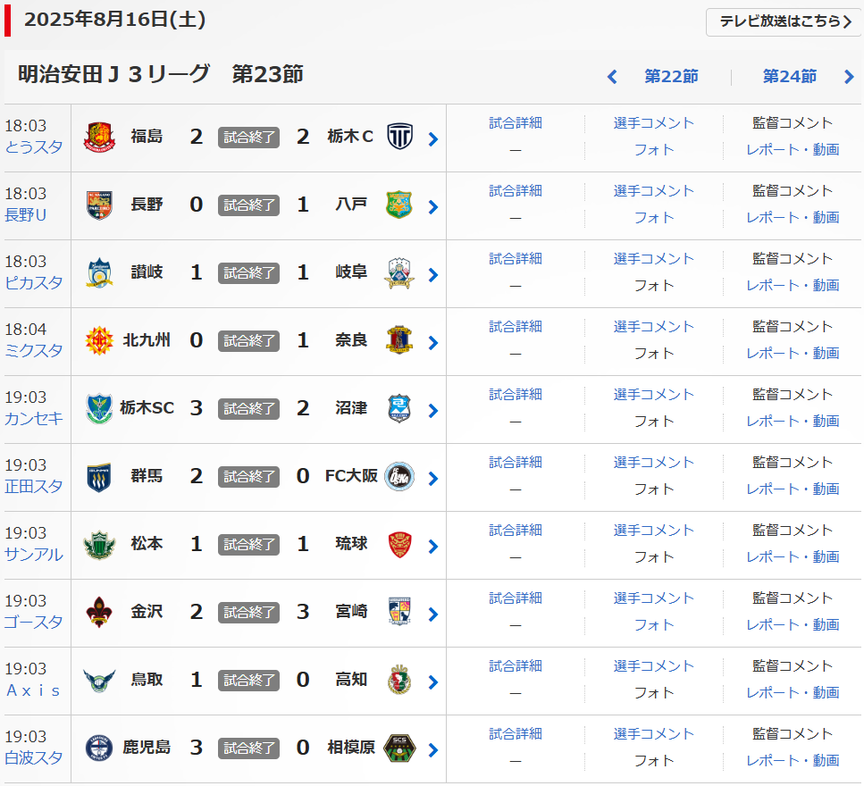 明治安田J3リーグの第23節が、8/16(土)に行われました。