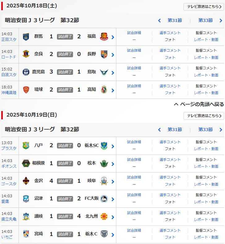 明治安田J3リーグの第32節が、10/18(土),19(日)に行われました。