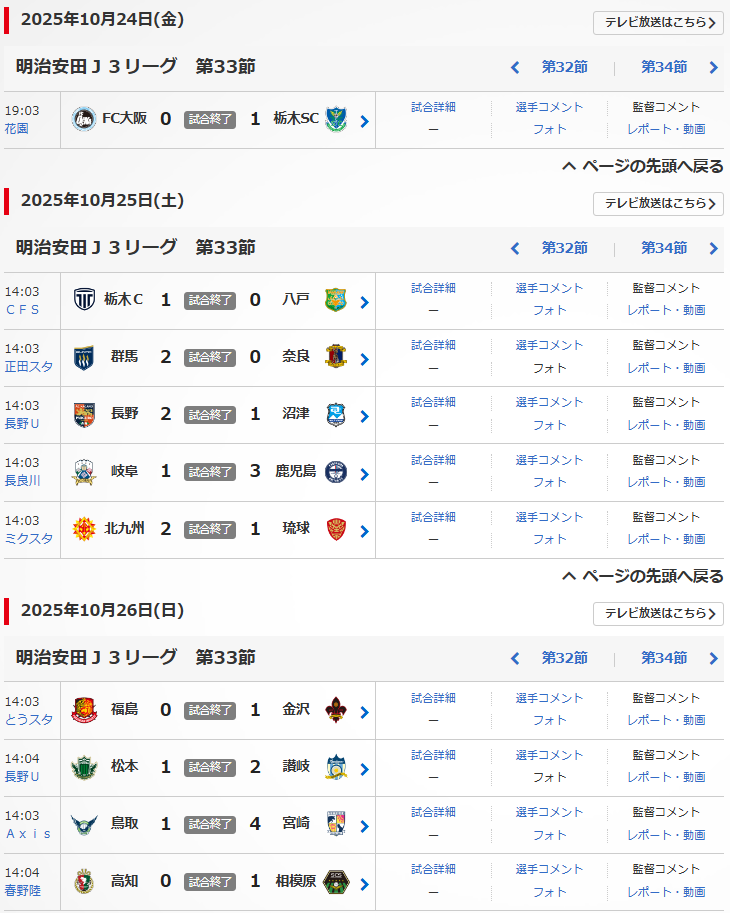 明治安田J3リーグの第33節が、10/24(金),25(土),26(日)に行われました。