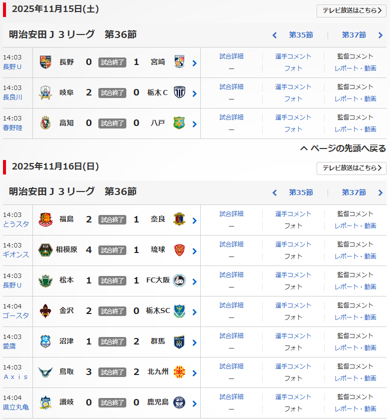 明治安田J3リーグの第36節が、11/15(土),16(日)に行われました。