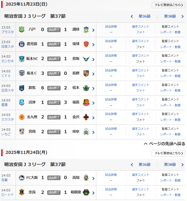 明治安田J3リーグの第37節が、11/23(土),24(日)に行われました。