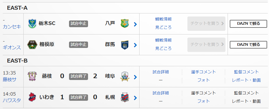 中止となった試合が2試合ありました。(栃木Svs八戸と相模原vs群馬)