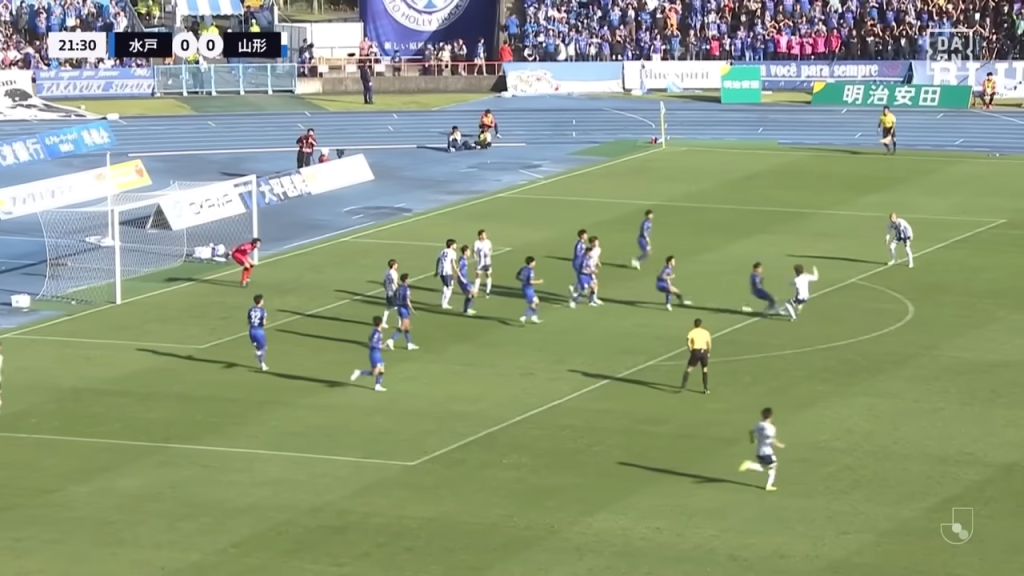 シュートが打たれる瞬間の水戸のDFラインはだれ一人残らずにゴールライン外まで上がっています。