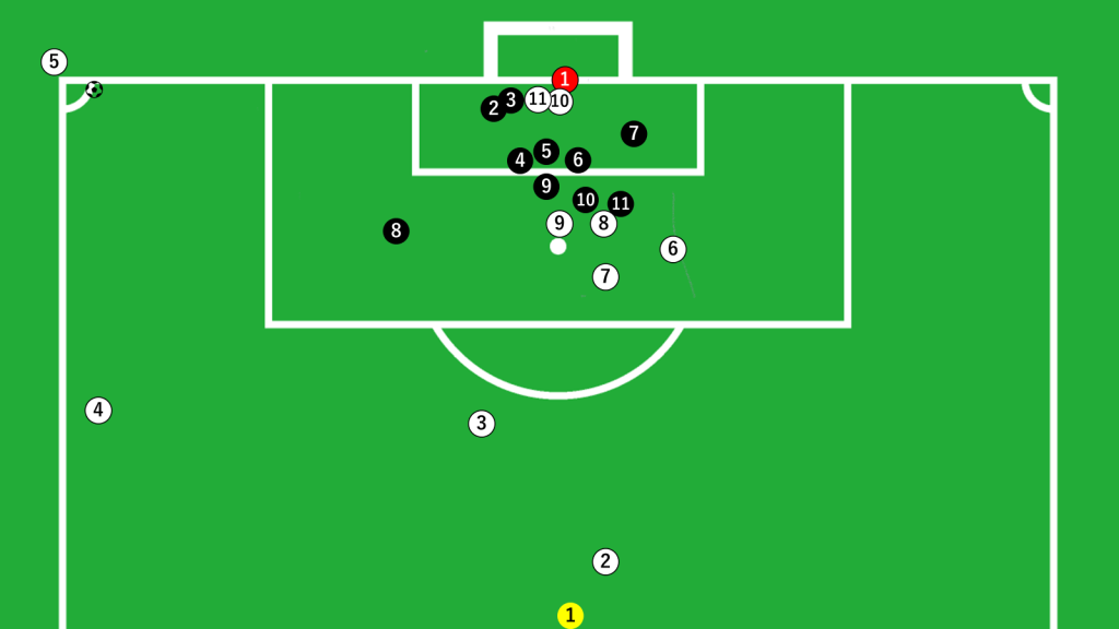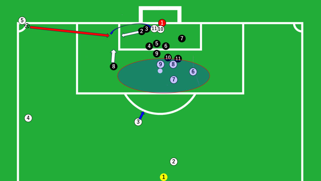 GK前にいた⑪がニアの位置に走り込み、ゴロのパスを受けています。