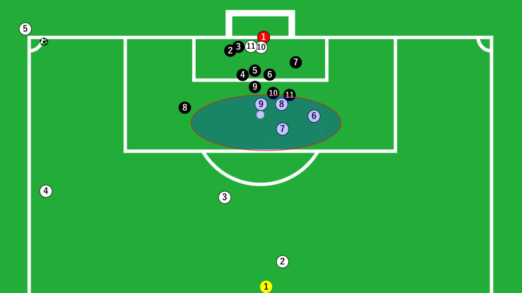 そこで、3選手(⑦,⑧,⑨)が、プレスに来るであろう3選手(➒,➓,⓫)をブロックしています。