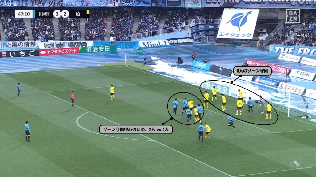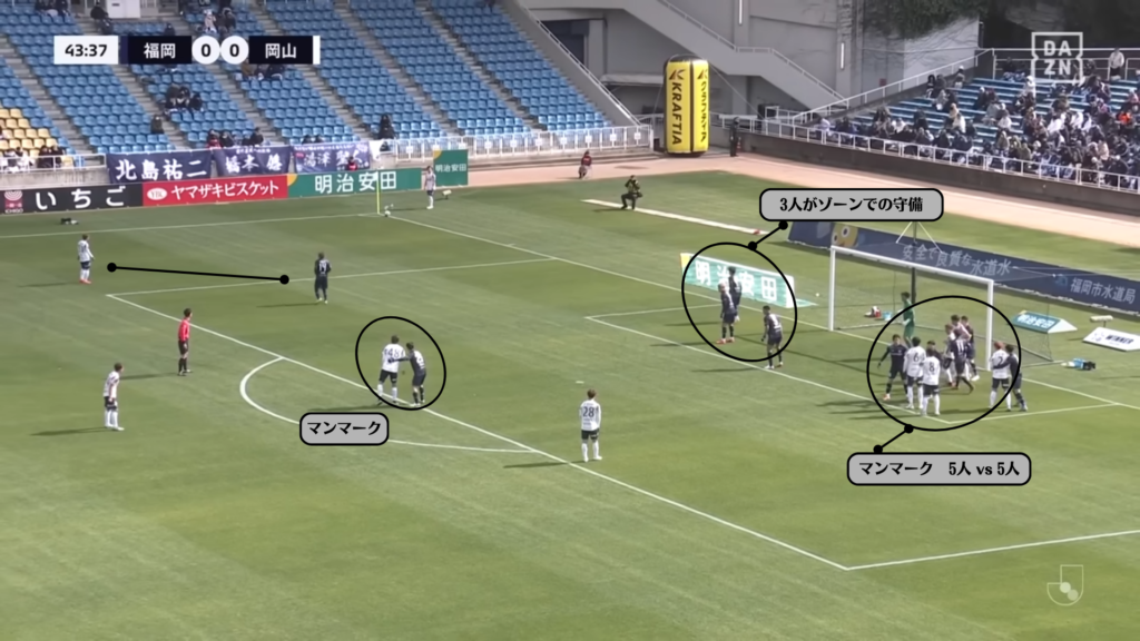 残りは、PKスポット付近で2人がマンマーク、ボール付近のケアを1人、ファーサイドでマンマークを1人が行っています。