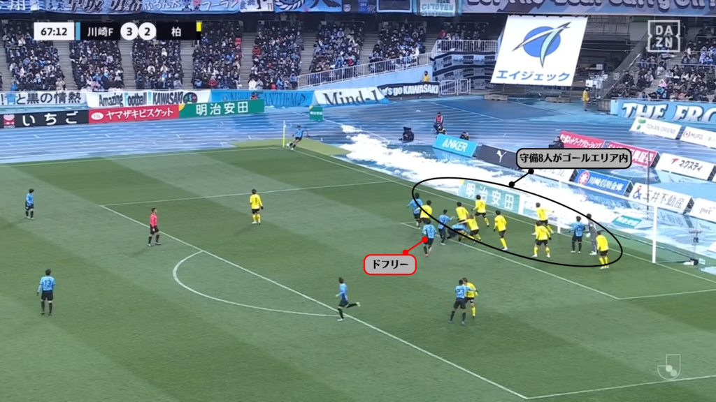その結果、ゴールエリア外の後方に1人が完全にフリーとなりました。ボールが蹴られた時点でDFは8人がゴールエリア内にいて、後方の選手への対応が遅れます。最終的には、そのドフリーの選手がヘディングで合わせてゴールを奪っています。