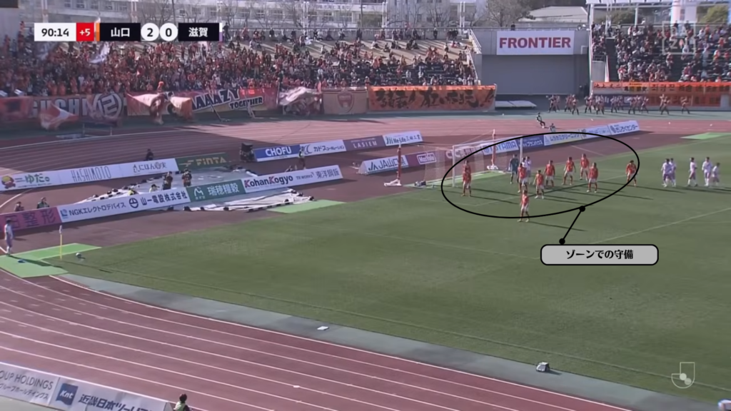 ゴールエリア内を中心にゴール前を固めた完全ゾーンでの守備をしています。