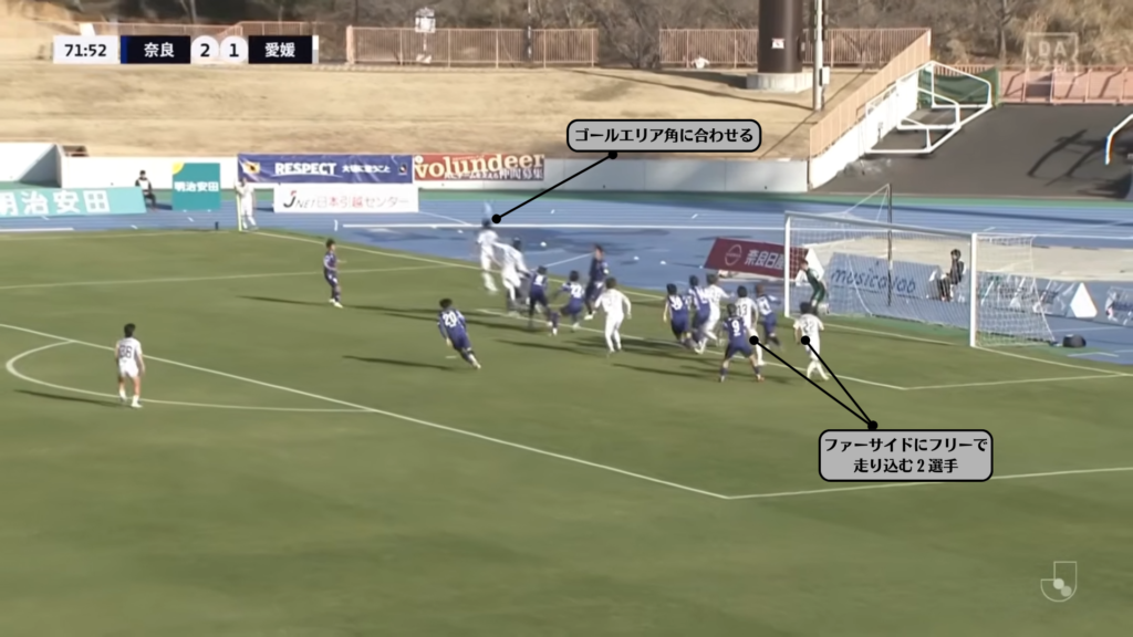 ①鉄板の”ニアそらしファー合わせ”(愛媛FC)