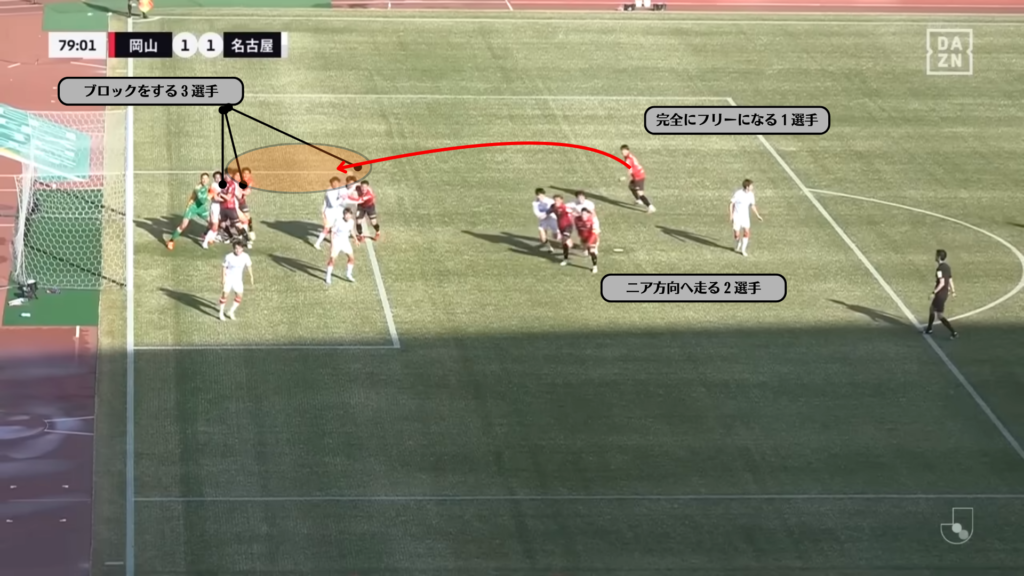 攻撃側はまず1人がニア方向へ走り出し、その動きにわずかに遅れてターゲットとなる選手が同じ方向へ動きます。
