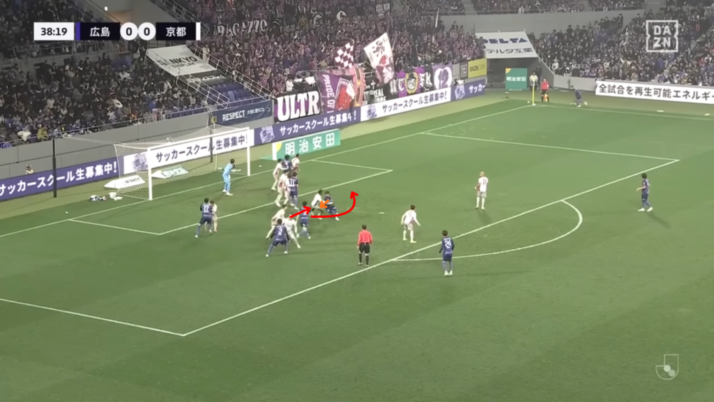 さらに、ゴールエリア内にポジションを取っている選手は、ファーへ向かうボールに対してDFがクリアへ入れないように体を入れてブロックしています。