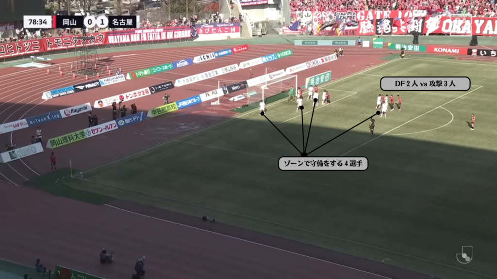 岡山はブロックを使ってスペースを作ることを狙った設計が多い印象を受けます。守備の選手の進路を一時的に制限することで、特定の選手が入り込むスペースを確保する形です。今回のケースではマンマークの人数が足りない状況が生まれていて、そこを突く形でフリーの選手を作り出していました。